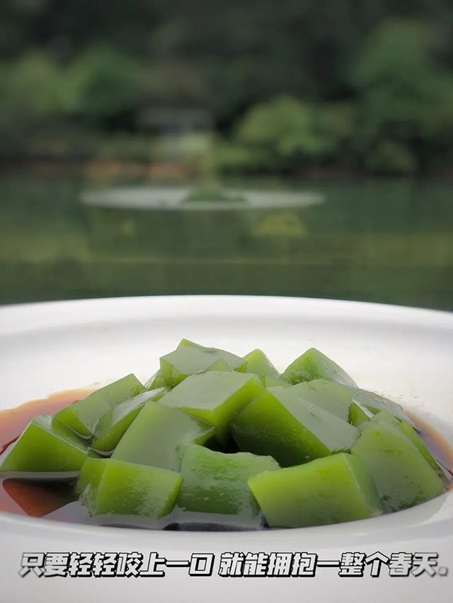 這道艾草青青凍是尋味老饕們在夏日不愿錯過的消暑神器,晶瑩碧綠的小方塊兒,瞅著就帶來清涼之感。