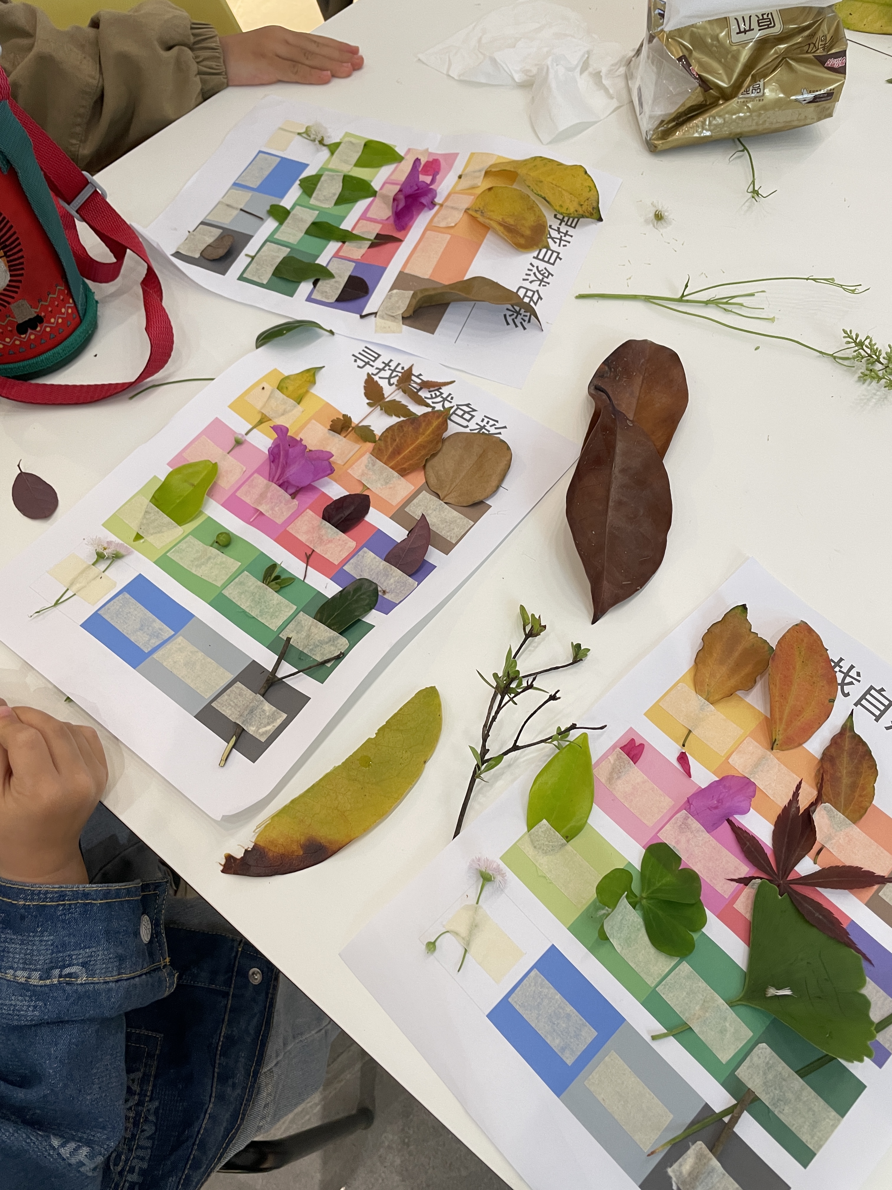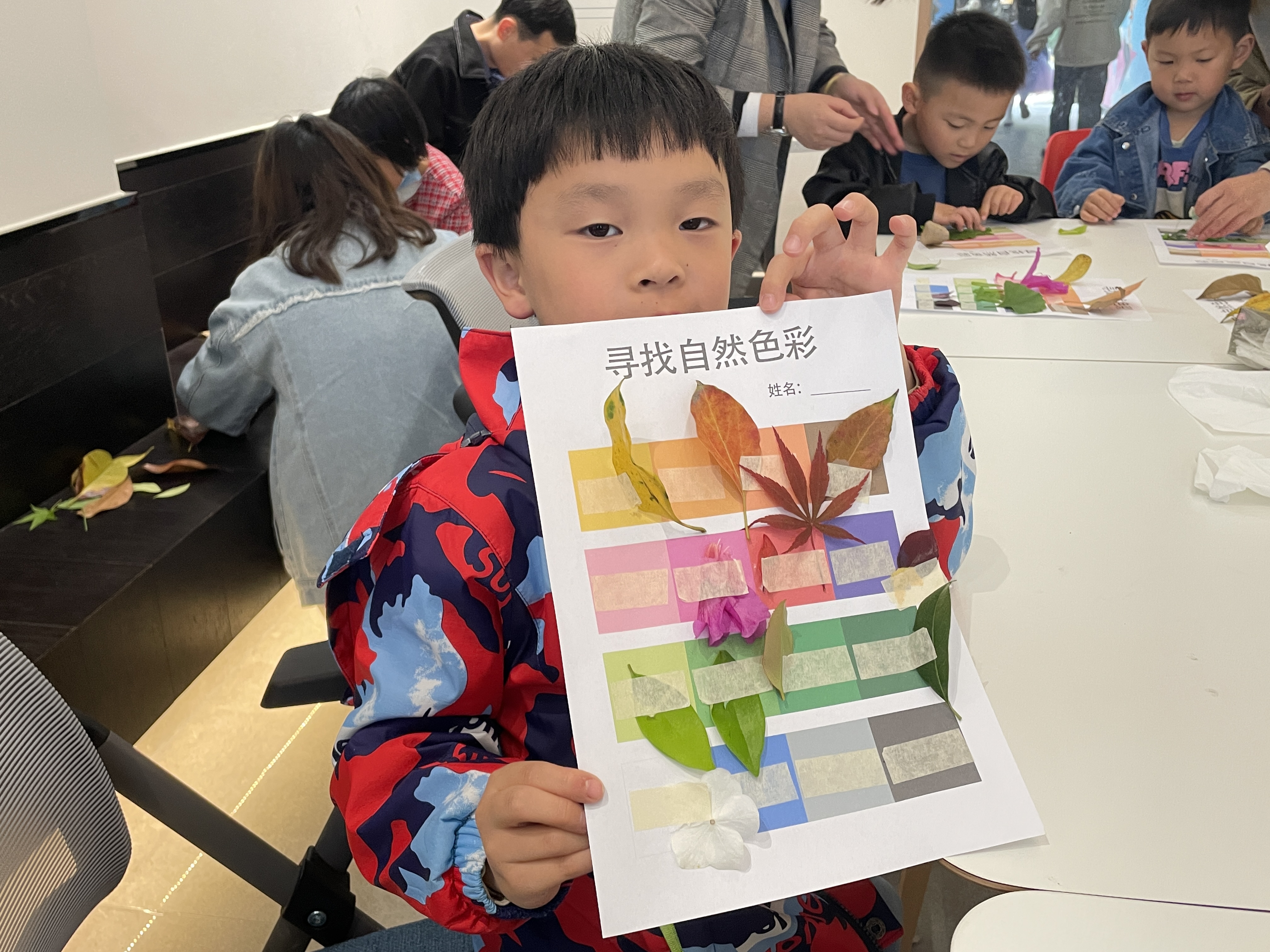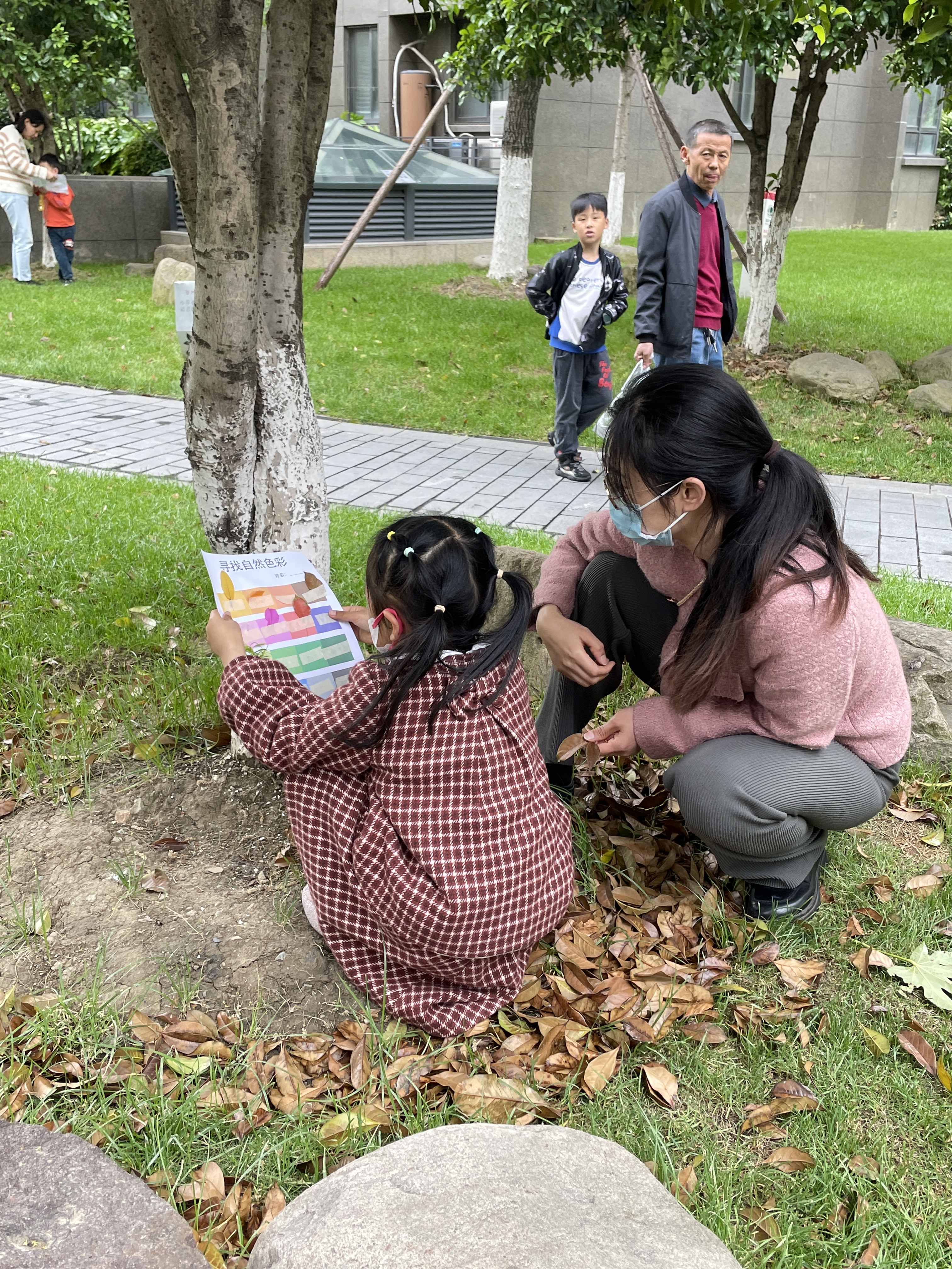 課程正式開始前,老師發(fā)放給小朋友們名為“尋找自然色彩”的色彩紙,小朋友們與父母一起去往小區(qū)內(nèi)尋找對應顏色的植物并粘貼在色彩紙上。
