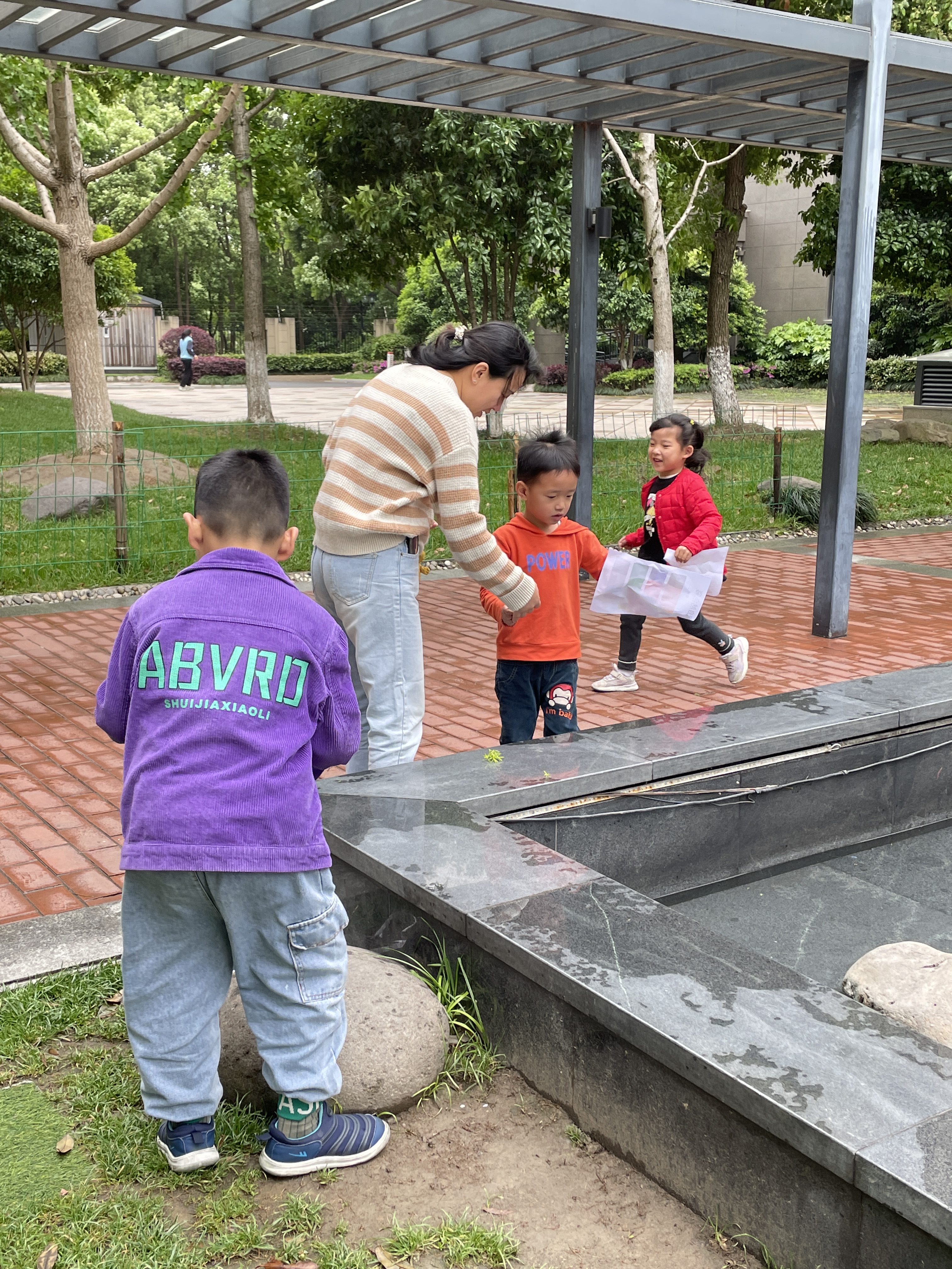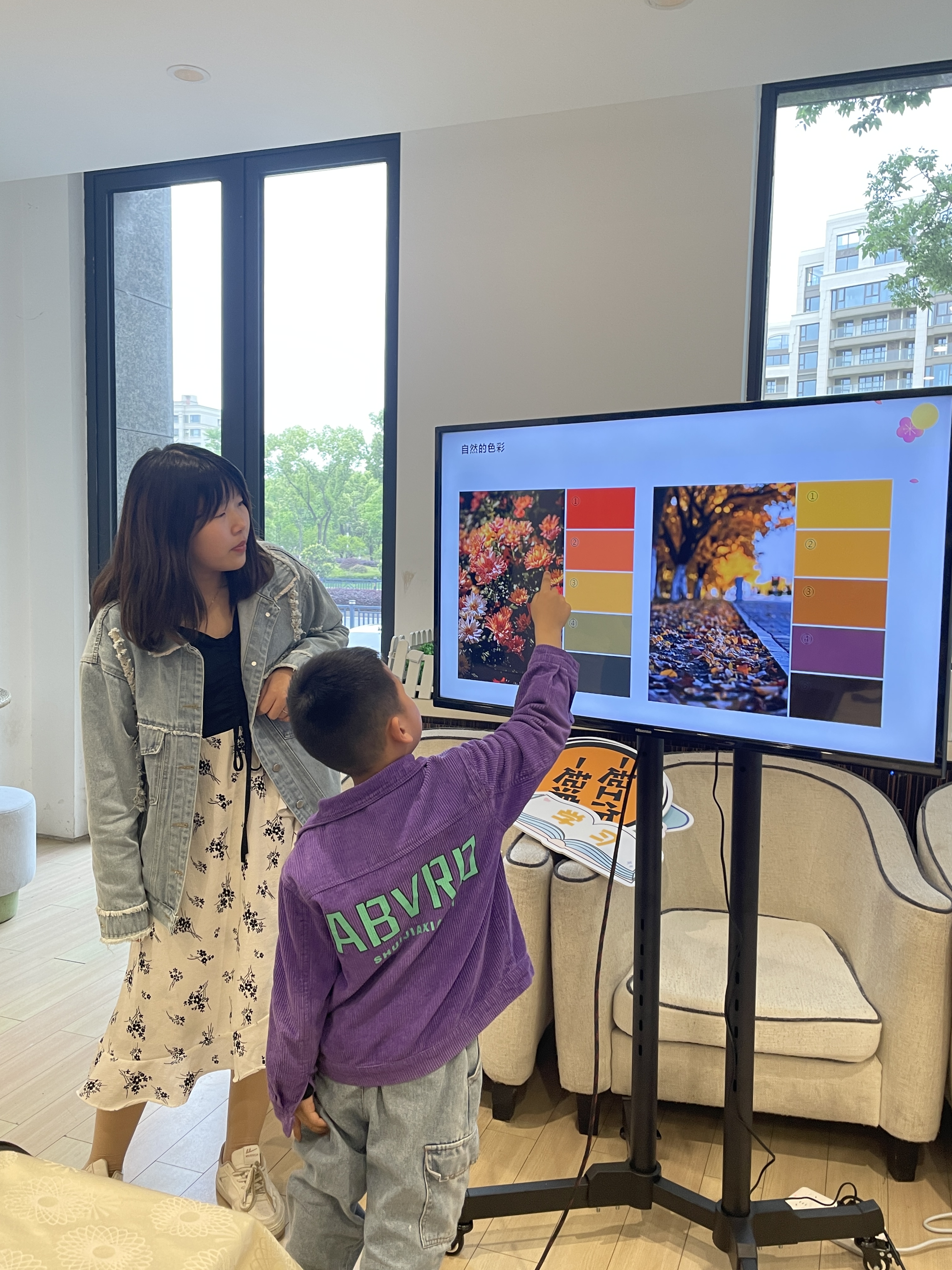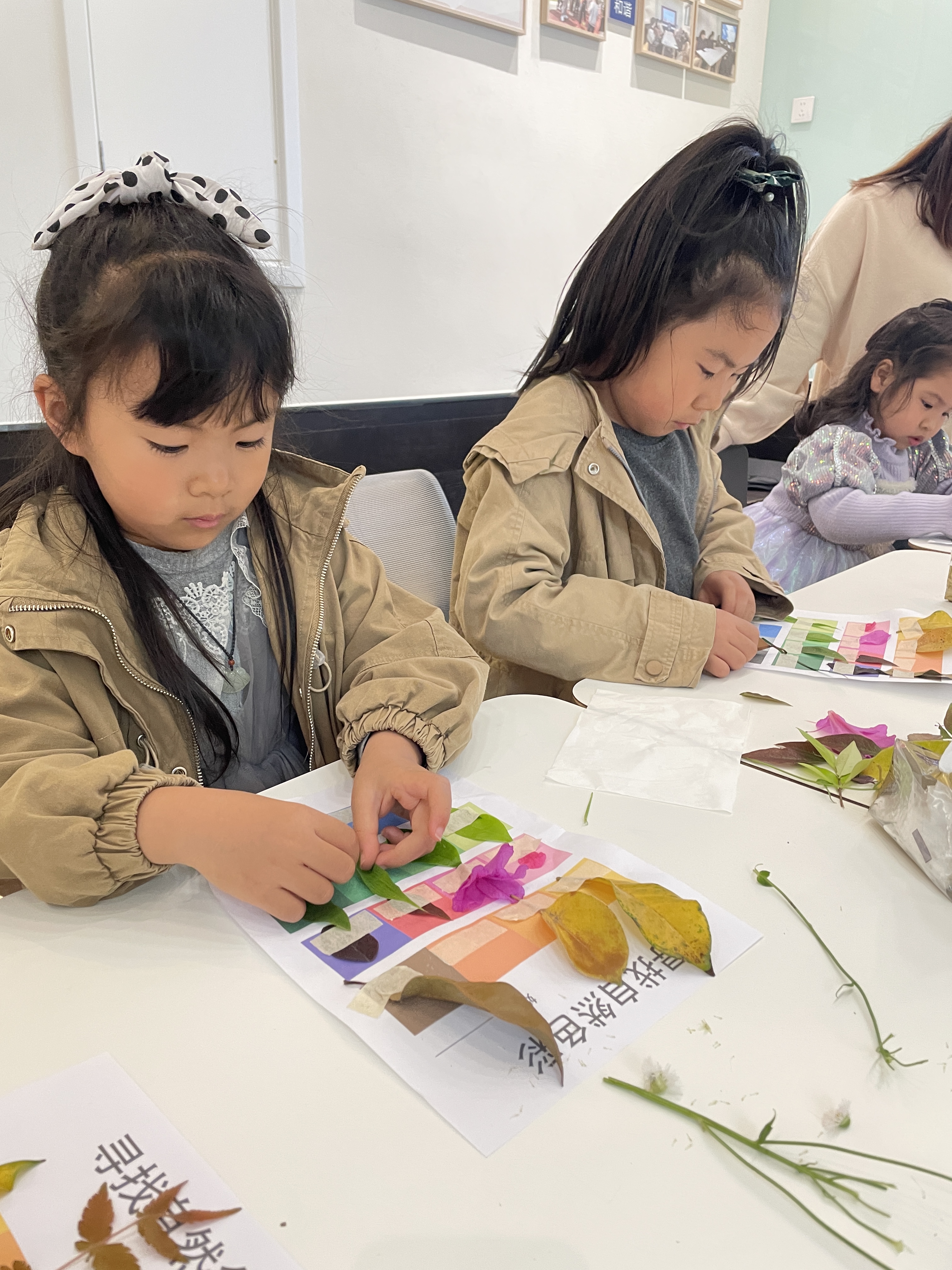 課程正式開始前,老師發(fā)放給小朋友們名為“尋找自然色彩”的色彩紙,小朋友們與父母一起去往小區(qū)內(nèi)尋找對應顏色的植物并粘貼在色彩紙上。