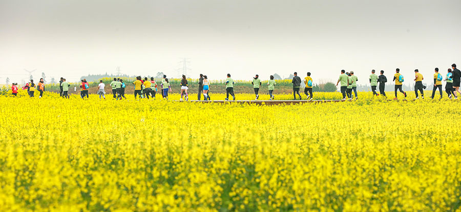 在本次比賽中,馬拉松賽道途徑金雞峰叢景區(qū),跑友們將在萬畝花海的簇?fù)硐拢騽倮慕K點(diǎn)奔跑,共賞油菜花齊齊盛放之美。