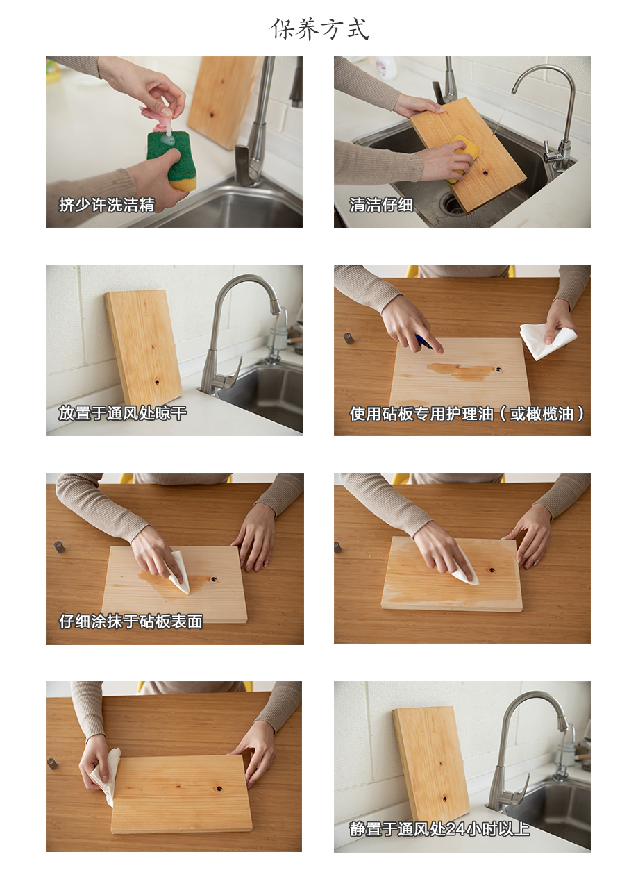 2??第一次使用前建議做涂油保養(yǎng)可預(yù)防木質(zhì)砧板變形、開裂、染色等情況的發(fā)生(圖9)。