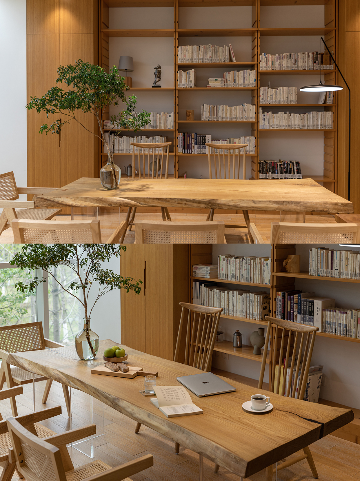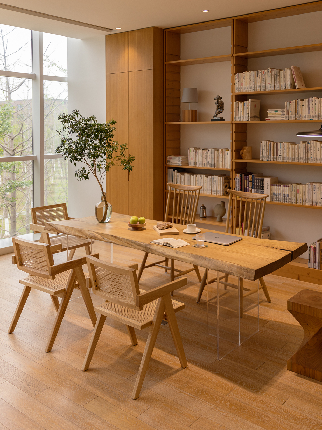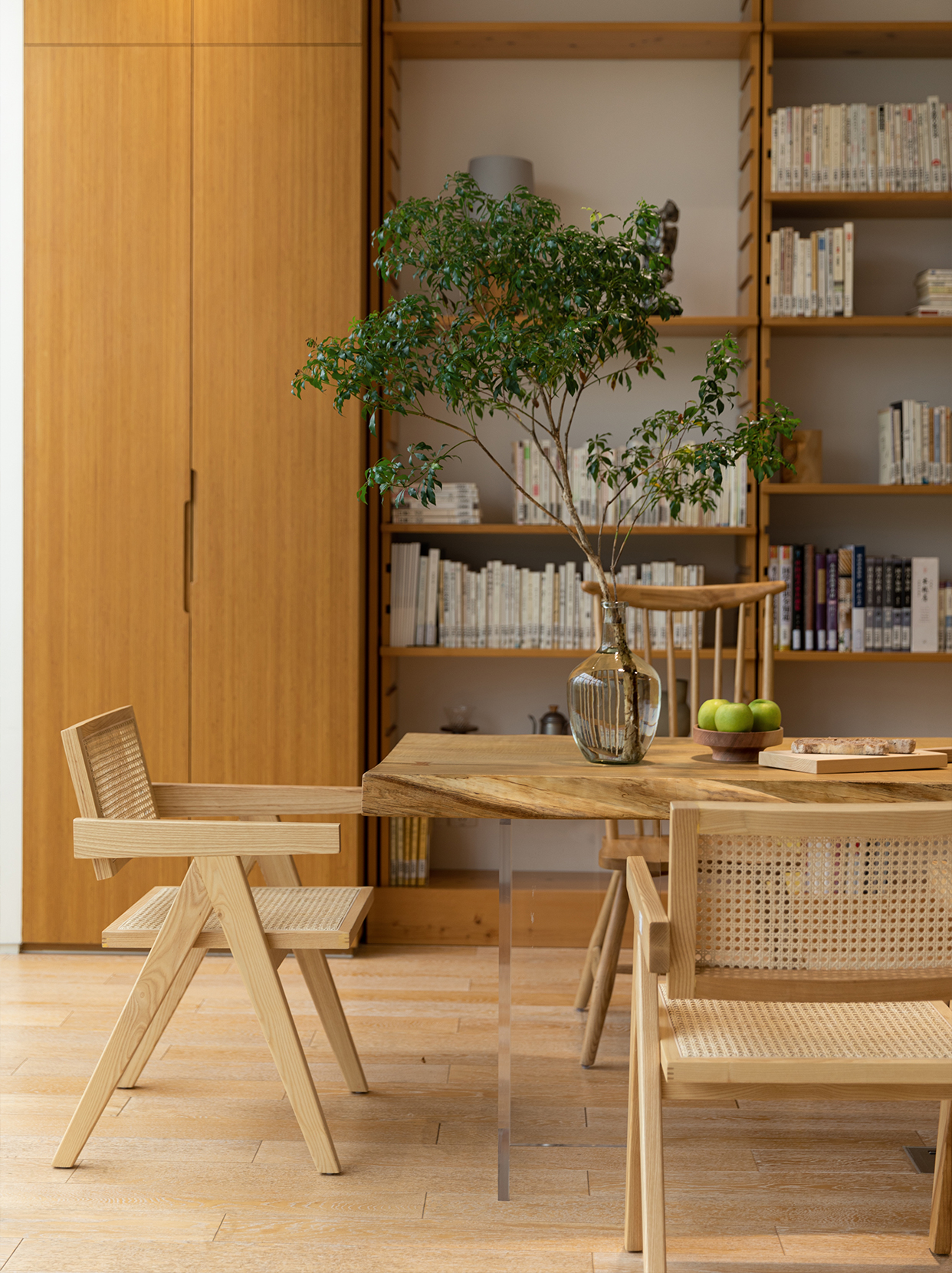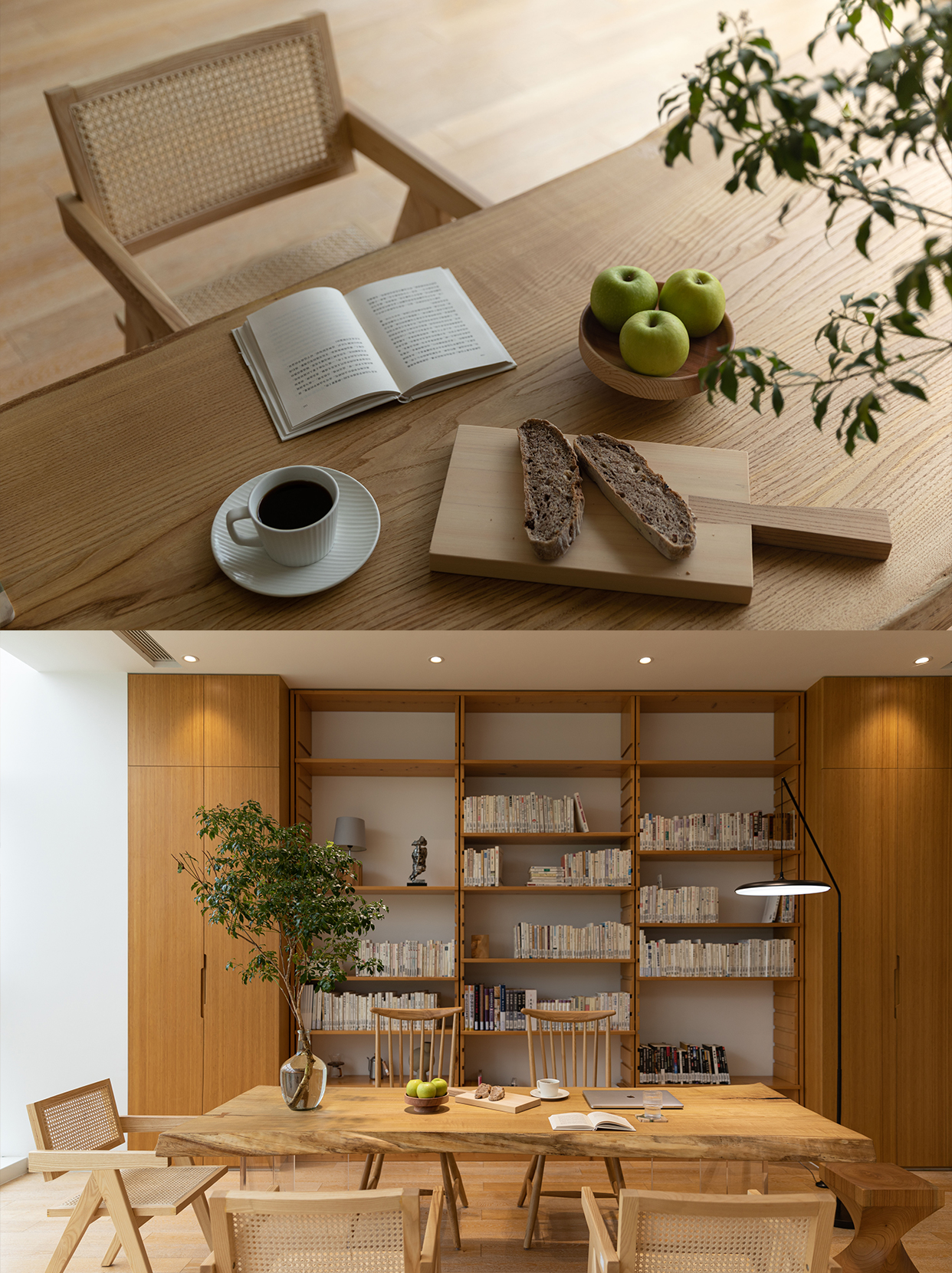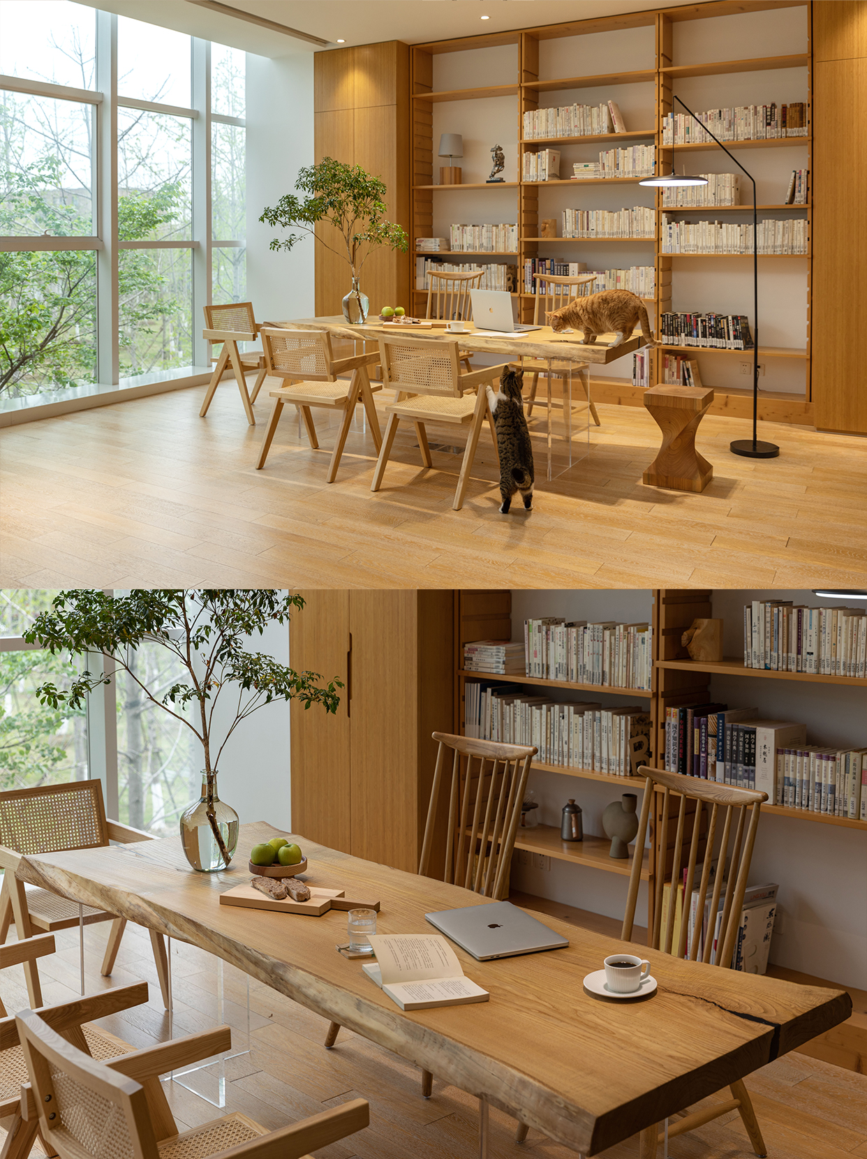 4??茶空間+咖啡角:在一張美貌與實用兼具的實木大長桌面前,你真的能忍住不來一杯茶or咖啡?周末會友、打發(fā)時間的最好伴侶。