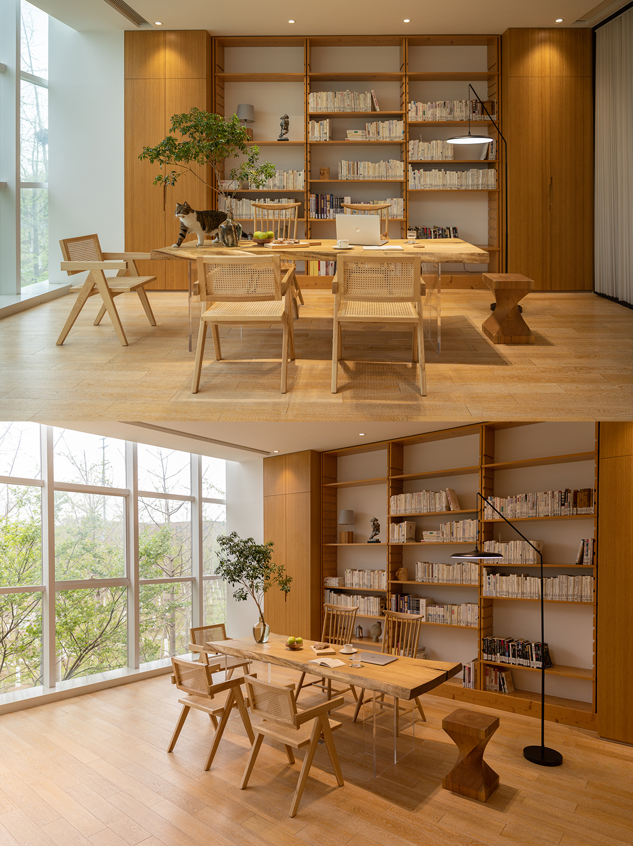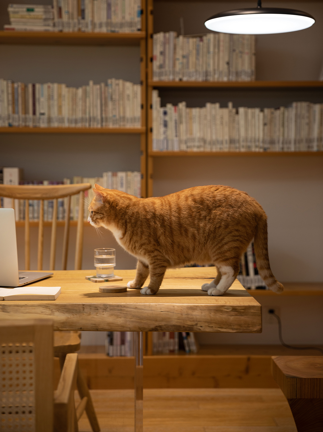 舍去一間小臥室,把大書桌放在客廳。做一個書墻,一面落地窗,養(yǎng)幾盆綠植。雨天的時候,開一盞溫暖的燈,就著一杯茶,可以發(fā)呆擼一天的貓。