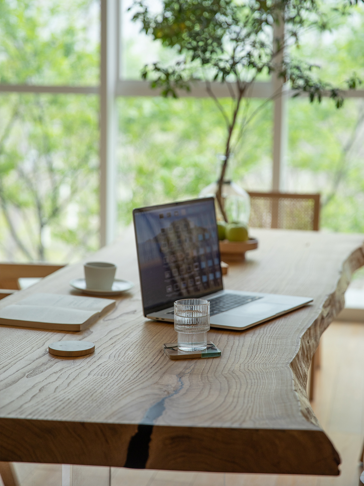 6??工作臺:實木大板桌--沉浸式工作學習必備。工作日下班回家,一家人在大長桌上就餐嘮嗑,飯后又可以秒變書桌,孩子寫作業(yè)看書,大人加班搞事業(yè)兩不誤!周末的時候,陪孩子做手工、畫畫、插花...