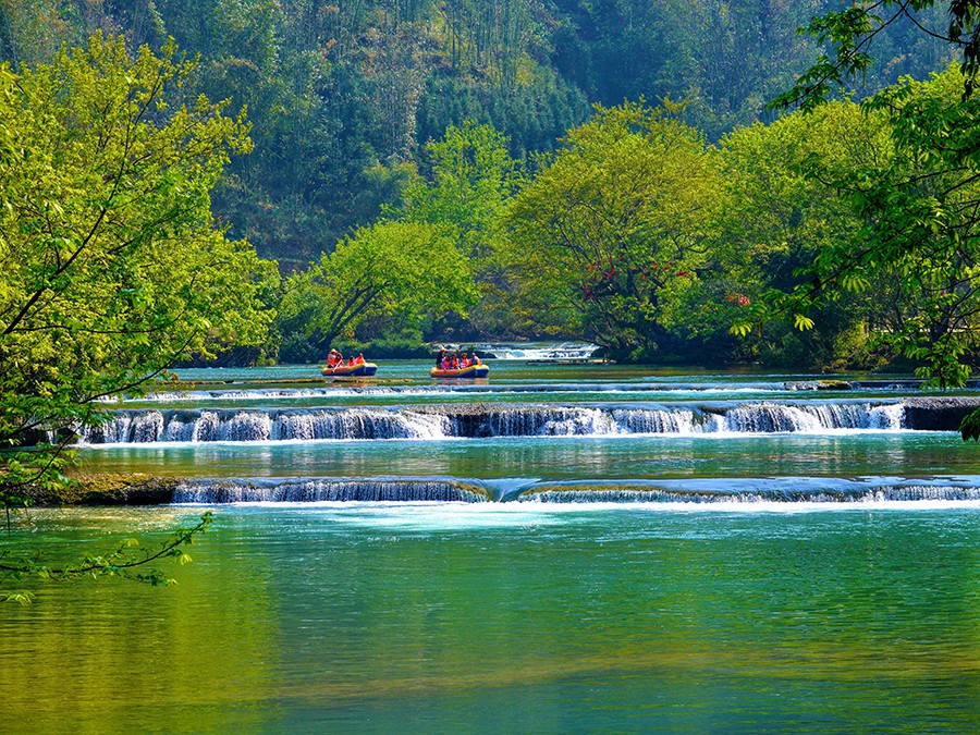 全長12公里的河道上,分布著40多個瀑布、疊水、鈣化灘,十彎九迭,河水剔透晶藍,布依村寨沿河而布。