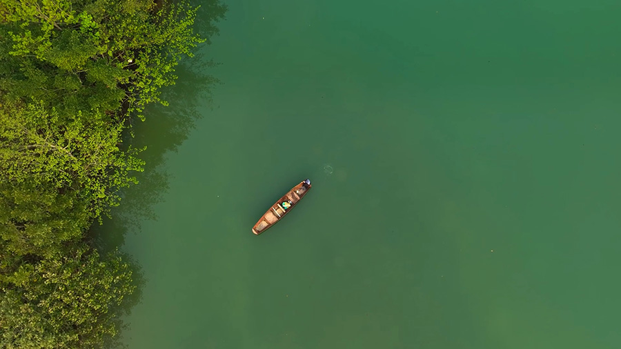 兩岸古榕參天,翠竹遍地,河水剔透碧藍,清澈見底,遠山近水倒映其間,美不勝收。