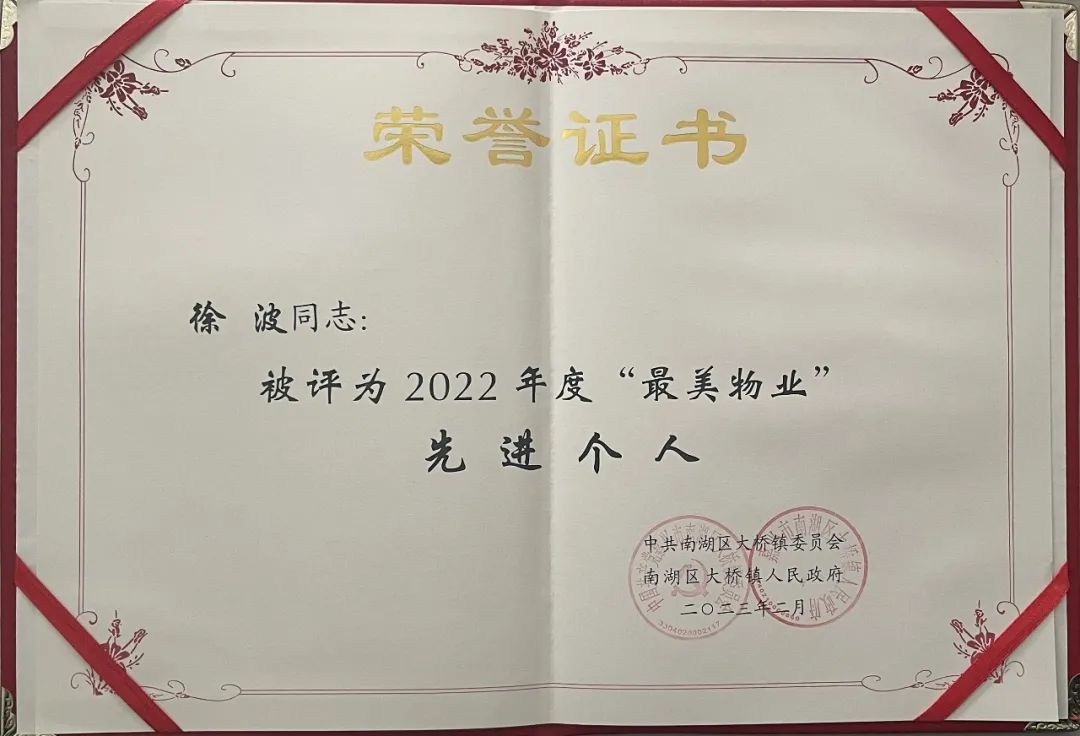 安甬物業(yè)榮獲2022年度“最美物業(yè)”先進(jìn)集體榮譽(yù)稱號(hào);安甬物業(yè)員工徐波、沈華培榮獲2022年度“最美物業(yè)”先進(jìn)個(gè)人。