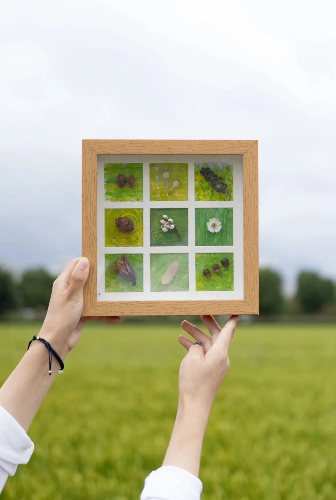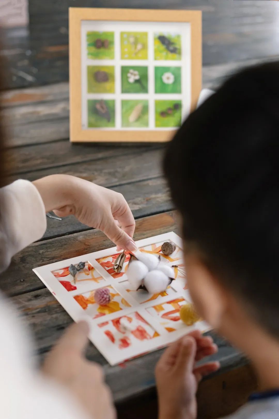 翻開田野的調(diào)色盤,自然的天地從不缺少飾品。這邊填上一顆蒼耳,那里放上一片銀杏葉,角落的位置,就留給棉花與芝麻休養(yǎng)生息。抬眼看一眼金色的稻田,嘿,我們用相框就能記錄秋天~